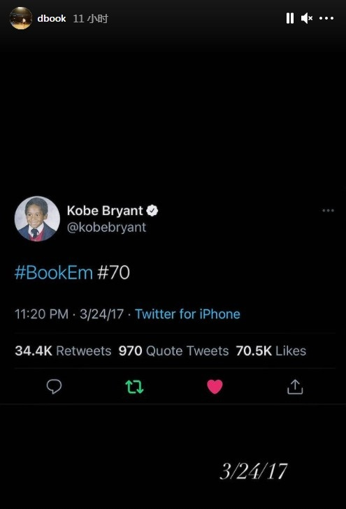 今日,布克也晒出了一张科比当年勉励自己的推文(如下图所示),并附上了当天的日期“17年3月24日”。