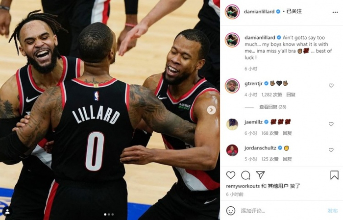 今日,开拓者球星利拉德更新个人Ins,晒出了一张与特伦特和胡德的拥抱合照并配文说到:“无需多言,我的兄弟们知道我们在一起经历了什么,我会想你们的✊🏽💯,祝你们好运!”