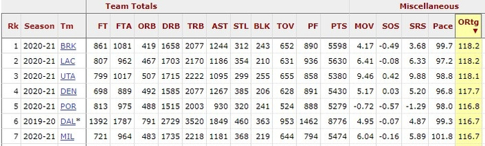 进攻至上!NBA球队单赛季进攻效率前五均出自本赛季 篮网居首