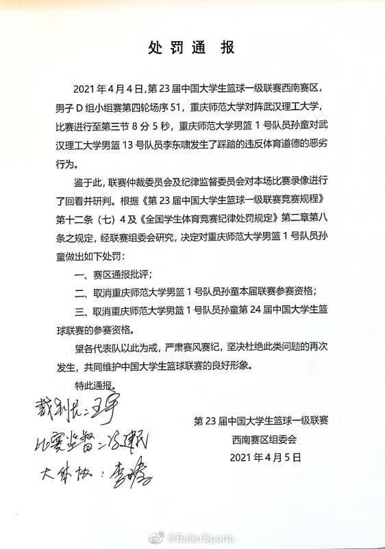 对此动作,中国大学生篮球联赛仲裁委员会及纪律监督委员会做出了裁决: