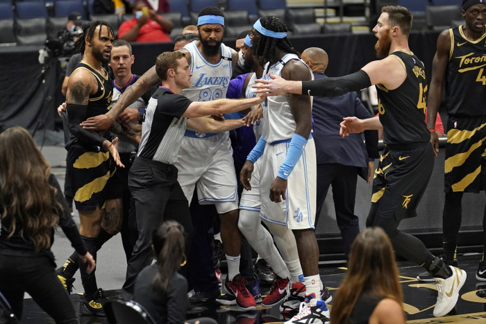 昨天的猛龙溃败于湖人的比赛,比赛内容单调枯燥,猛龙第一节就被湖人打花,全场比赛始终被湖人压制。不过在第一节还有2分24秒出现激烈的一幕,阿努诺比上篮遭遇施罗德犯规,随后他直接掀翻了施罗德,而之后双方的球员一拥而上!场上也出现了激烈的冲突,但这之后,裁判回放判断阿奴诺比和哈雷尔被驱逐。赛后施罗德表示:“我对阿努诺比下手很重,因为我不想让他有轻松得分的机会,我只是试图通过这种方式避免他打成二加一,但是他所做的是完全没必要的,你可以用这个动作去参加WWE。”施罗德的说法可能有点夸张,但阿努诺比的动作确实引起了不小的争议。