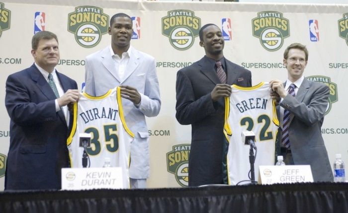 曾经他们同是华盛顿特区马里兰州长大的孩子,兄弟俩都有一个共同的爱好——打篮球。从很小的时候起,格林就和杜兰特在一起训练,一起拼搏,梦想着进入NBA变成强者。但他们一定想不到他们能在同一年进入NBA,而且进入同一支球队效力。2007年选秀,震惊全美的凯文-杜兰特毫无意外地被西雅图超音速队选中,而握有5号签的凯尔特人选择了杰夫-格林,但在雷阿伦的那笔交易中,他被安吉送去了西雅图。两个儿时的玩伴就这样阴差阳错的再度相遇,西雅图超音速也有了最初的“双子星”。而在2011年,雷霆为了得到帕金斯,将格林送去了波士顿。杜兰特得知后十分伤心,他坦言那是他第一次认识到NBA是一个商业联盟,因为他和格林的友谊已经远远超过了篮球。兄弟俩在俄城的家是邻居,从进入NBA就一直在一起,他们谁也没设想过有一天因为一次交易而分开。