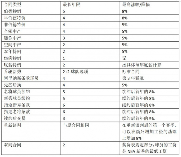 总体来说,NBA球员薪水的年限和涨幅与他们签约的合同类型有关,正常情况下,例如一支球队在工资帽以下签约自由球员时,签约的最长年限为4年,最大加薪幅度为5%。但随着签约合同的不同,也有很多其他情况,详见下表:
