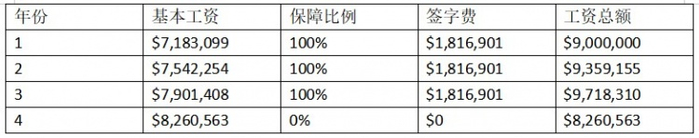 如上图所示,第一个赛季的基本工资是$7183099,该金额的5%是$359155。这是基本工资或总工资(最右边一列)可以每年变化(上涨或下降)的最大数额。然而,在第4年中,总工资减少了1457746美元,就是因为签字费与无保障工资的组合是不相容的。该合同可以通过多种方式来调整(用以保障球员利益),如协调加薪、增加保障部分工资与增加签字费等。