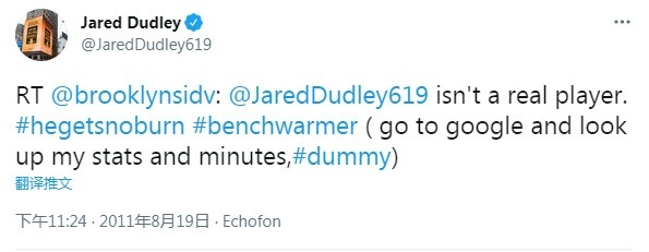要说湖人队目前真正的Benchwarmer,杜德利说第二没人敢说第一。然而早在2011年,就有网友称“杜德利不是一名真正的球员,还带上了#Benchwarmer的话题。”