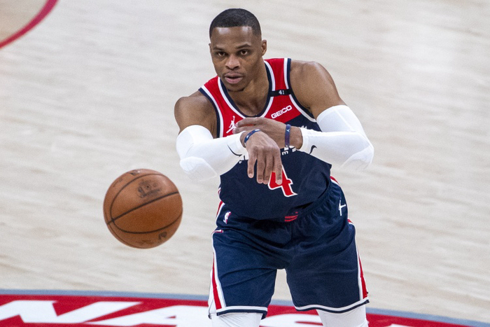 赛季至今,威少场均得到21.6分10.6篮板10.8助攻。