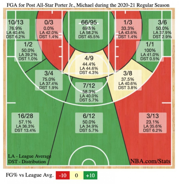 2020-21赛季常规赛全明星周末后小迈克尔-波特投篮热图(绿色高于联盟平均、红色低于联盟平均、黄色和联盟平均水准持平)LA:联盟平均命中率 DST:出手占比