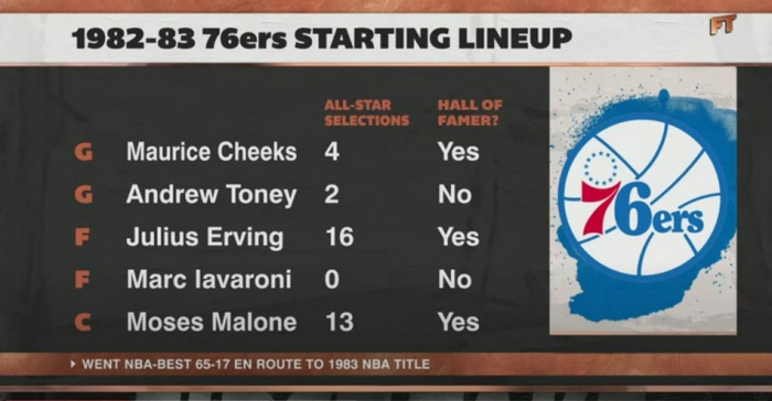 “让我们看看J博士所在的球队吧,他夺冠的那支76人队,虽然那时他已经不小了,但他仍然是一个全明星。奇克斯,四届全明星。安德鲁-托尼,两届全明星,一个场均20分的家伙。J博士,当时联盟最佳之一。在魔术师和伯德之前,J博士是联盟最卖座的。除此之外他们还有摩西-马龙,当时最好的篮球运动员。不知道为什么人们都不记得这一点了。他在火箭队的时候让当时的湖人队很难堪,他是3届MVP。他们席卷了所有人——这才是超级球队:多个MVP,多个全明星。谁在乎到底是管理层把你们凑在一起,还是球员自己选择在一起的?”