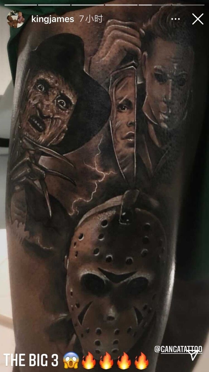 其次是影视四大杀人魔之一的弗莱迪-克鲁格,出自电影《猛鬼街》(A Nightmare on Elm Street)。克鲁格可以入侵孩子们的梦,并在梦中将他们杀死。(詹姆斯的新纹身之一。)