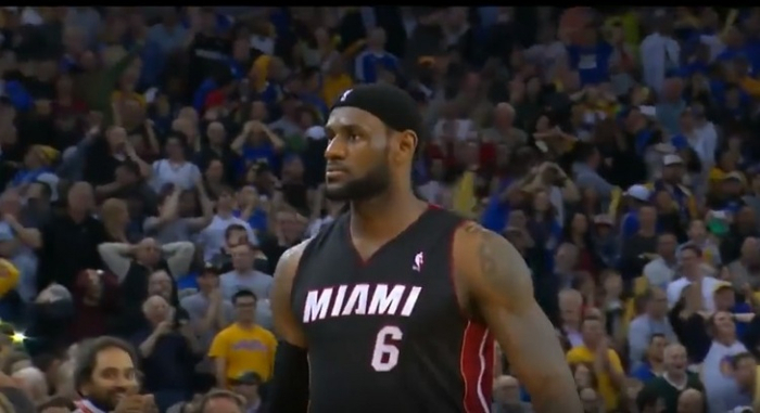 最后14.6秒,热火队没有叫暂停,勒布朗摆脱格林和一哥两人缠斗接球,热火其他队员全部拉开到三分线,詹姆斯面对伊戈达拉压着秒表3..2..1...出手三分,扬手命中,比赛时间只剩下0.2秒。詹姆斯表情冷漠,走到中场,面对客场球迷走起了标志性的霸王步,气宇轩昂、傲睨万物、君临天下!全场球迷也被詹姆斯的强势表现所征服,回报詹姆斯最热烈的欢呼。