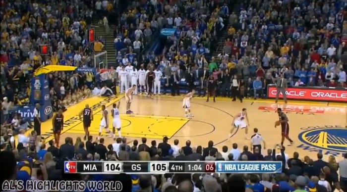 最后一分钟,热火1-2-2落位为詹姆斯拉开单打,詹姆斯单挑汤普森,干拔三分命中!热火队再度领先。库里强突查尔莫斯,撤步点飞,再起跳投命中,47.7秒,两队战成107平。下一个回合,热火队继续拉开,詹姆斯再两次掩护后,伊戈达拉换防到詹姆斯身前,詹姆斯强突造成伊戈达拉犯规两罚一中,23.3秒勇士落后一分。