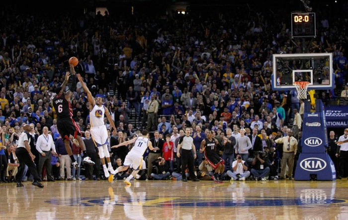 短暂停后勇士队尝试把球给到曾经0.1秒绝杀的大卫-李,但波什把传球破坏.全场比赛,詹姆斯热火队凭借詹姆斯逆天表现和三分绝杀1分险胜。