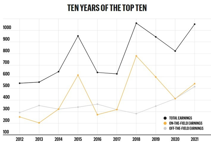 场外收入(Off-the-field):赞助、出场费、授权收入,以及该运动员所经营的任何企业的现金回报。