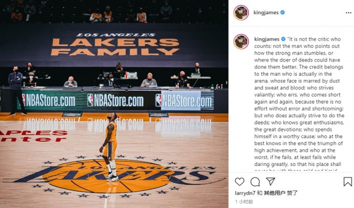 直播吧5月21日讯 今日,湖人球星詹姆斯更新个人Ins,引用了美国前总统小罗斯福的一段演讲《荣誉属于真正在竞技场上拼搏的人》的内容:“荣誉不属于那些批评家,不属于那些指出强者是如何跌倒或是用嘴说出哪里可以做得更好的人。
