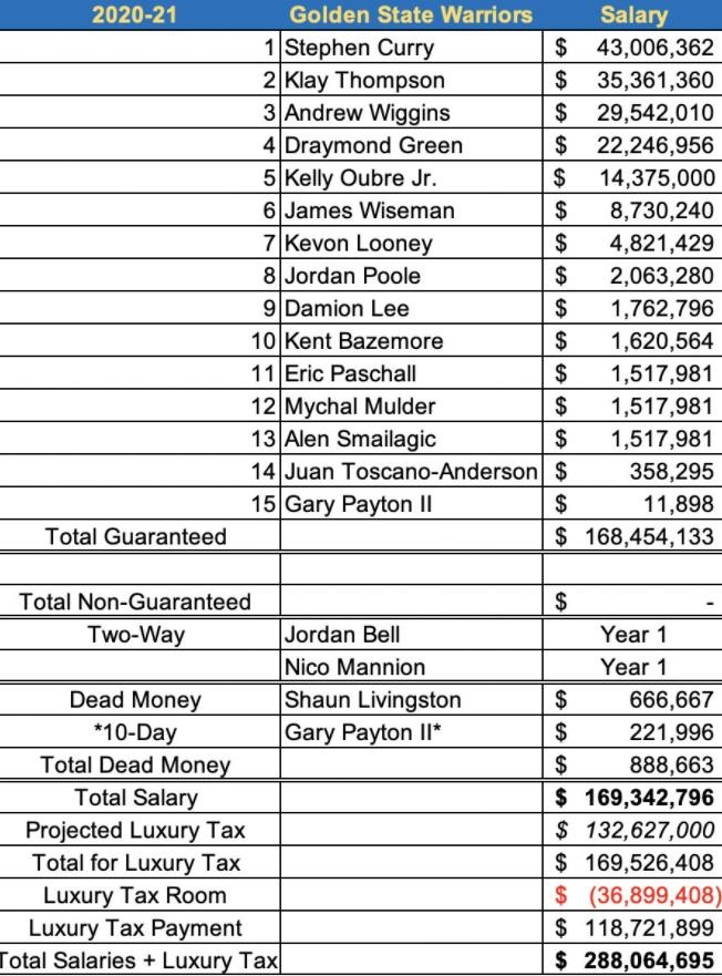 据统计,勇士本季一共要缴1.187亿美元的奢侈税,这是NBA历史上最高金额的税单,也是无缘季后赛球队缴的最高金额税。