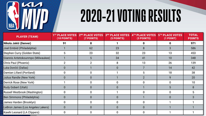 整个赛季约基奇连续第二个赛季保持全勤,场均砍下26.4分10.8个篮板和8.3次助攻均创下生涯新高,得分、篮板、助攻、抢断四项数据位居全队榜首。在MVP的投票评选中,约老师得到了全部101张第一选票中的91张,以总分971分大幅领先第二名毫无悬念当选,并创下四大纪录——