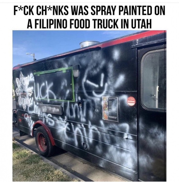 (餐车被破坏前:上面写着FuxkChixks等对亚裔的辱骂词语)