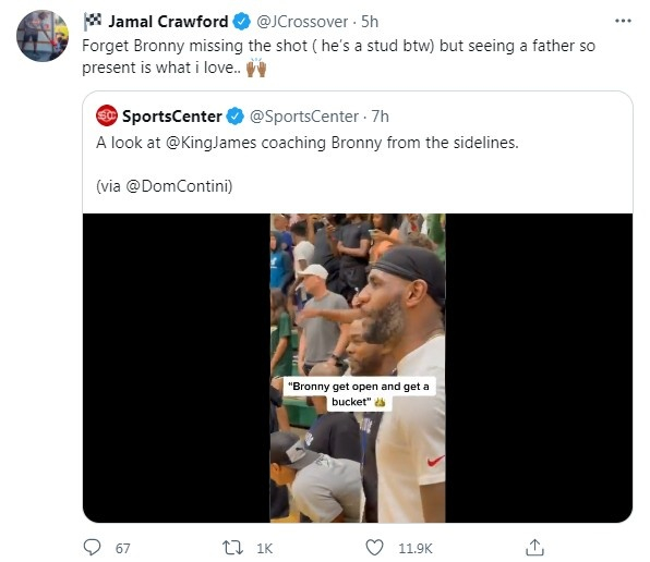 贾马尔-克劳福德则是转发了相关视频,评论道:“忘记布朗尼投丢了这件事吧,顺带一提,他是个好苗子,而且一名父亲这么做是我喜欢看到的事情。”