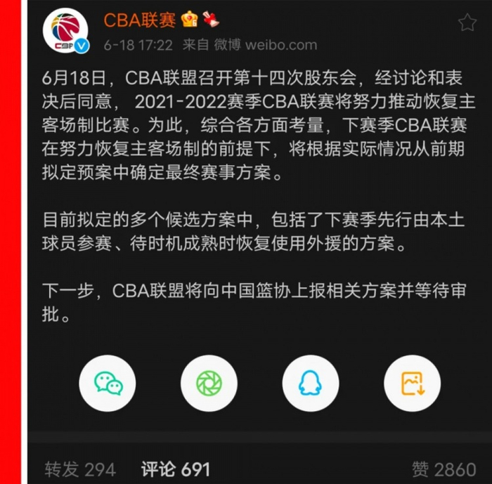 这个事件的来龙去脉,首先要回溯到将近一个月前CBA的股东会。6月18日,股东会经过表决,决定下赛季恢复主客场制,先采取全华班,是不是允许外援参赛,视疫情发展而定。
