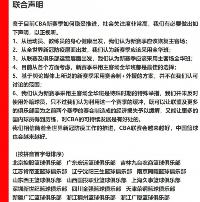 不过因为时间紧,这个《联合声明》出台的过程并不严谨,比如,你并没有在微博上的《联合声明》看到有任何俱乐部的盖章。一些有外援需求的国企球队、成绩差的民企球队如上海、北控、同曦等,对自己怎么上了声明一头雾水。