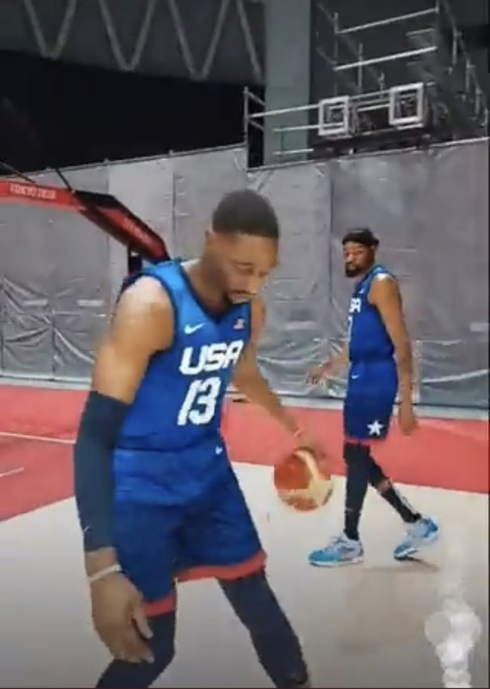 直播吧7月23日讯 美国男篮今日进行了定妆照的拍摄,拍摄现场,杜兰特和阿德巴约还有了一个“小摩擦”。