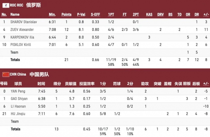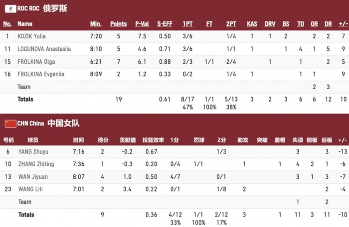 罗马尼亚身高不够,最矮167,最高184,中国女队在篮下拥有绝对优势,所以1分球11中9。俄罗斯却有身高192的中锋洛古诺娃,张芷婷的身高优势就没了,结果她一球未进,只靠罚球得了1分。篮下没了统治力,中国女队只能勉强远投,2分球12中2。相反,俄罗斯队内外通吃,2分球13中5。