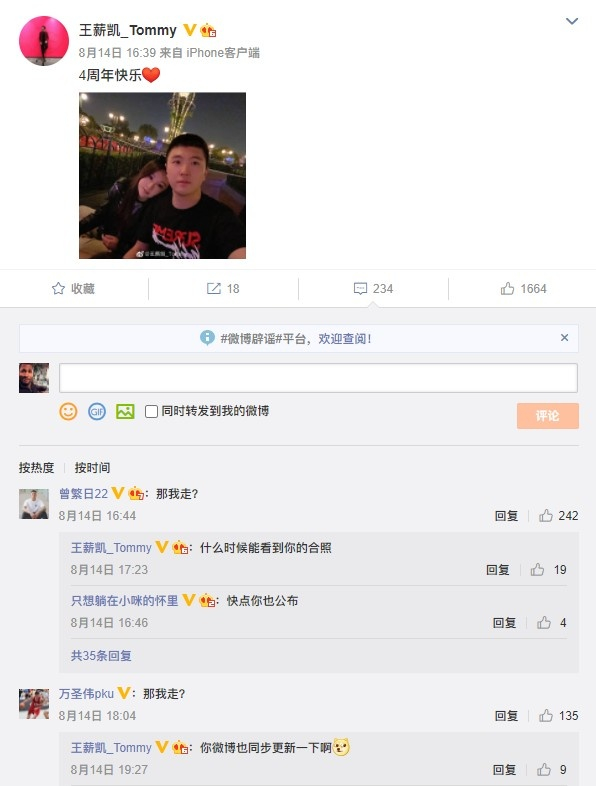 “四周年快乐❤️。”王薪凯在图片旁边写道。