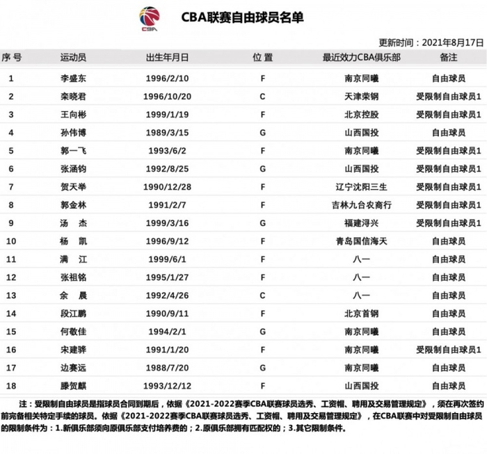 CBA“自由市场”开张了!距离新赛季CBA联赛国内球员注册截止日只有不到半个月时间,日前CBA联盟公布了新一批自由球员名单。截至今天,共有18名球员上榜,其中不乏张兆旭这样的本土名将,不少人成为各球队追逐的对象。