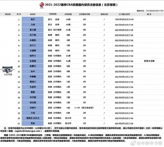 “【2021-2022赛季CBA联赛北京首钢首次注册球员第一批完成注册】