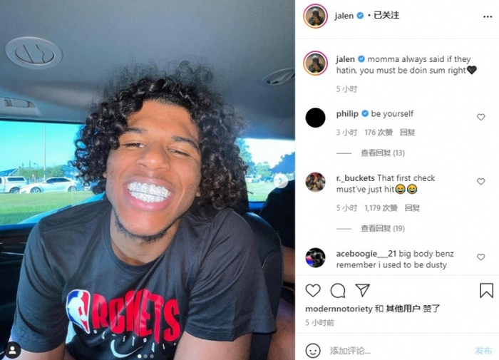 直播吧8月24日讯 今日,火箭球员杰伦-格林更新个人社媒晒出了自己满嘴镶钻的牙齿并配文说到:“妈妈经常告诉我,如果别人讨厌你那么你一定是做了正确的事情。”