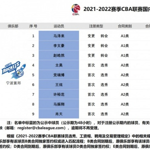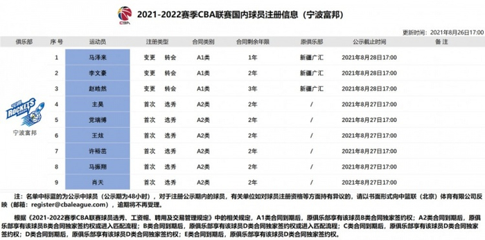 直播吧8月26日讯今天,CBA官网更新宁波富邦男篮国内球员注册信息表。