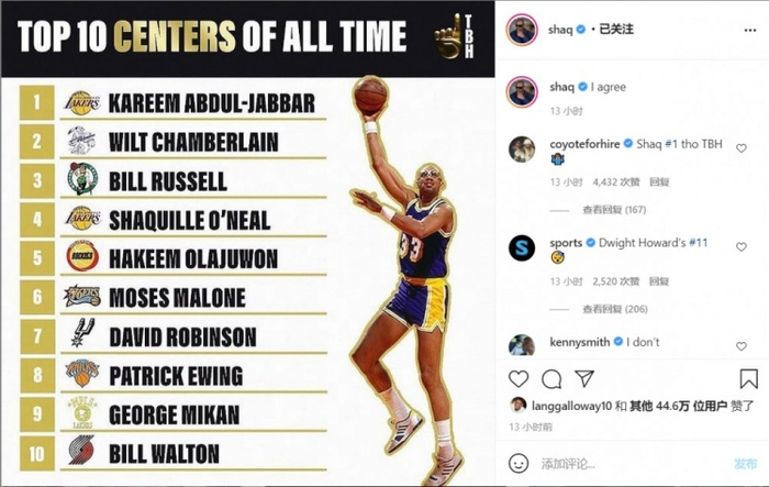 奥尼尔社媒晒出历史十大中锋排名图:我同意这个排名