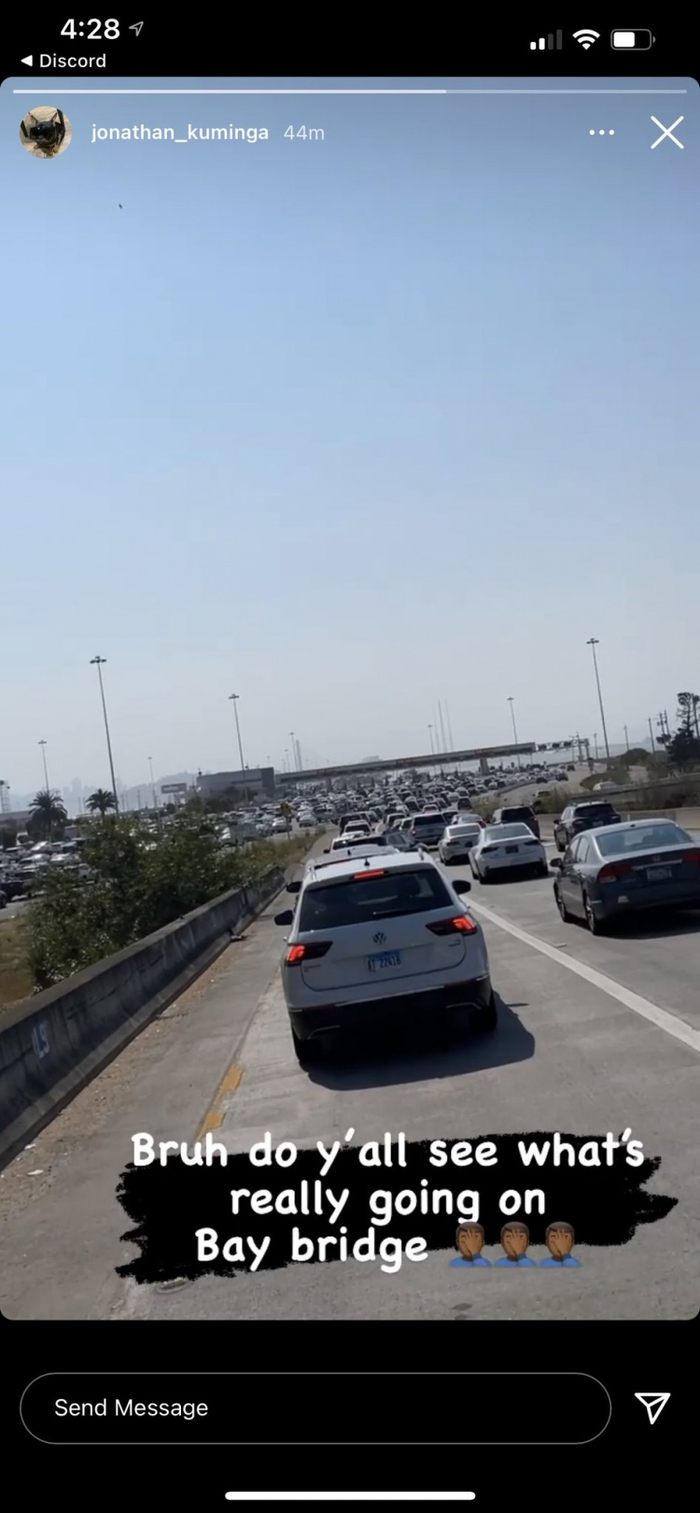 库明加吐槽自己被堵在海湾大桥上 网友:所以克莱才搞了艘船