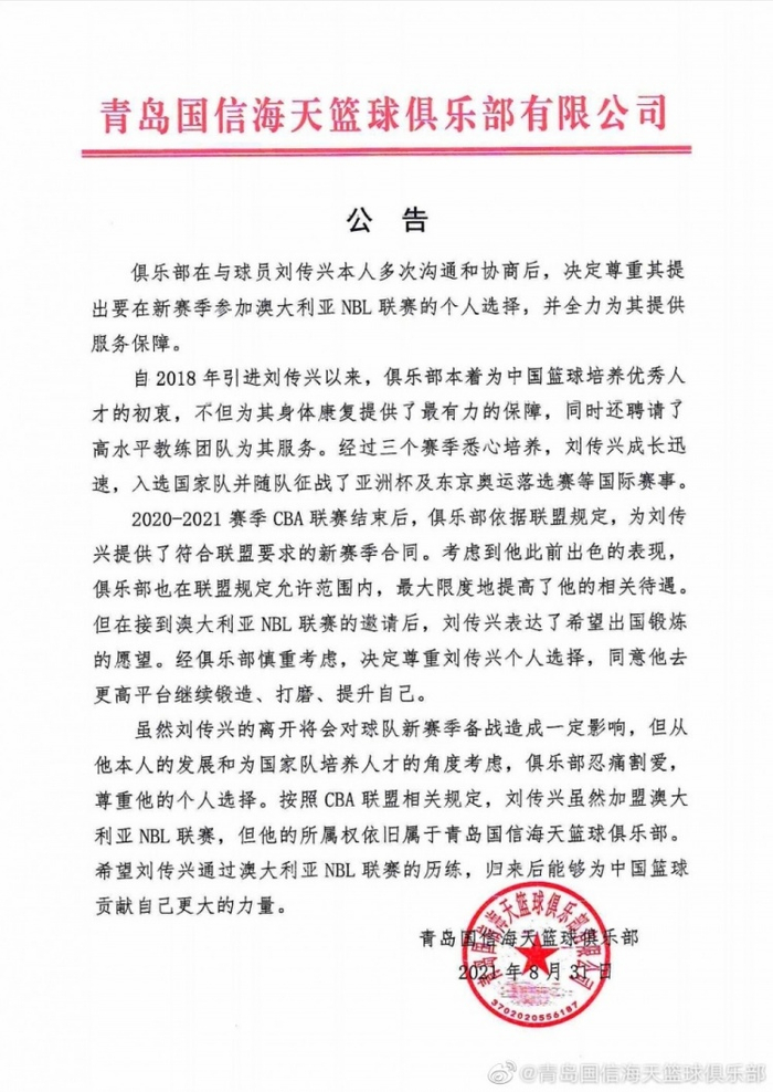 直播吧8月31日讯 青岛男篮官方发布了公告,表示尊重刘传兴个人的选择,将忍痛割爱、同意他参加新赛季澳大利亚NBL联赛的比赛,但刘传兴的所有权仍然属于青岛男篮。