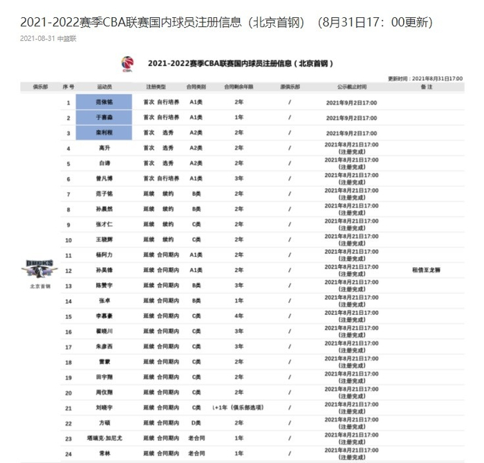 CBA官方:北京首钢青年队范依铭升一队 5号秀栾利程完成注册