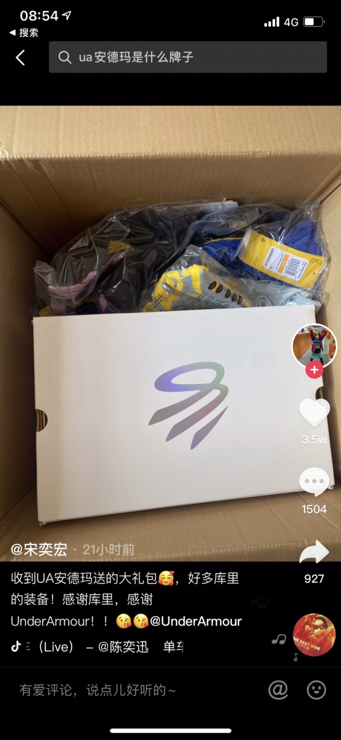 昨日,宋奕宏在其社媒上晒出了自己收到的库里给他寄来的大礼包,其中都是UA的装备。