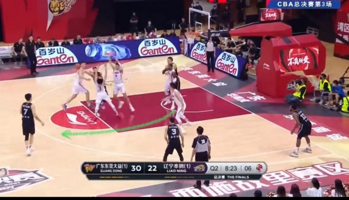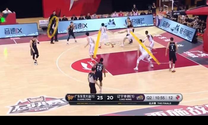 球到底线胡明轩迅速到位,广东队已经完全变成了2-3联防的站位,此时空位在球场的另一侧,但球却很难过去,这样2-3联防容易露底角的缺点就被很好的藏了起来。