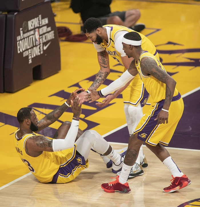 安东尼-戴维斯因为跟腱伤势开始休战,一个月之后,詹姆斯遭遇了生涯最严重的伤病之一,高位踝关节扭伤,直到季后赛开始前他才勉强复出。值得表扬的是,湖人队的其他队员仍然众志成城,没有在两名核心球员无法登场后就丧失了对比赛的信心。戴维斯共缺席了36场比赛,詹姆斯共缺席了27场比赛。到赛季结束,湖人仍然能打出联盟中最好的防守效率。