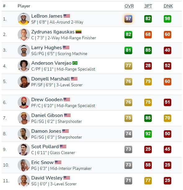 2006-07赛季的骑士就是经典球队之一,这支球队中,詹姆斯能力值97,大Z82,拉里-休斯81,瓦莱乔77。