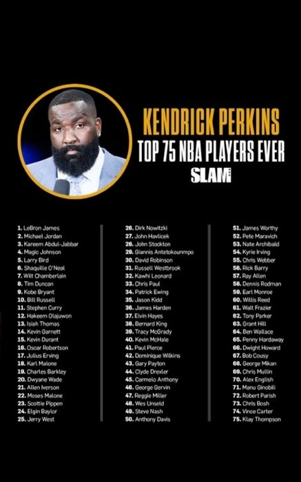 帕金斯排NBA75大球星:老詹居首 乔丹第2 科比9 库里11 KG14 KD15