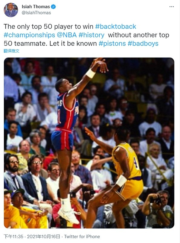 托马斯在推特写道:“NBA历史唯一一位背靠背夺冠的Top50球员(注:应指当赛季),且(球队中)没有另一名Top50的队友。让大家知道它 #活塞 #坏孩子军团。”
