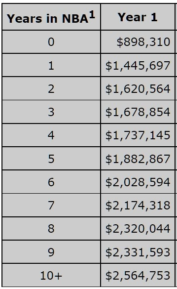 而下图就是球员在NBA中效力年份与其能拿到的底薪的具体数字(注:下图数字为上赛季的底薪数字。每个赛季的数字会随着工资帽变动而变动)。