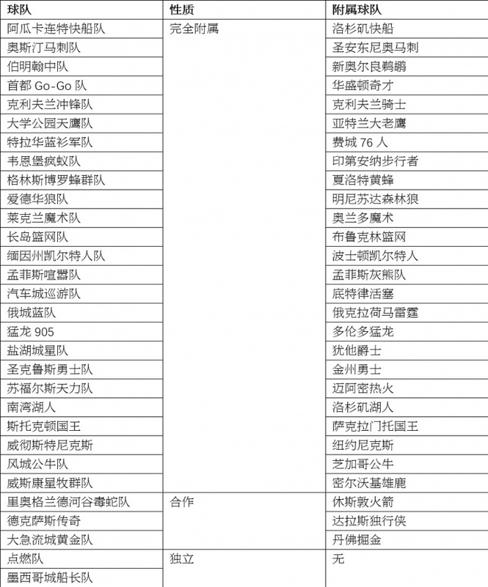 2021-22赛季G联盟有30支球队,其中有26支是完全附属于NBA球队的;2队保持相对的独立,但是由某支NBA球队资助和支持的。除此之外,还有2支G联赛球队是完全独立的,不属于任何NBA球队,其一是点燃队,另一个是墨西哥城船长队。