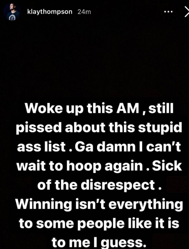 克莱今日写道:“今天早上醒来,还在为这份愚蠢的名单生气。X的,我已经等不及想要去打球了。受够了这种不尊重。我猜,对有些人来说,胜利并不是一切,比如我。”