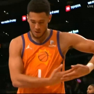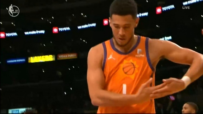 首节,威少单打布克打成后做出经典“摇娃娃”动作,第三节,布克打成2+1后,做出了相同的动作。