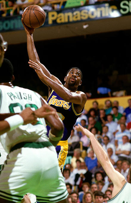 6、1987年6月10日总决赛第四战,著名的“小小天勾”之战,湖人客场107-106战胜凯尔特人,3-1拿下总决赛赛点。在贾巴尔带伤出战全场17中5的情况下,约翰逊打出29分8篮板5助攻。比赛最后时刻,魔术师面对绿军三巨头伯德、麦克海尔和帕里什的防守突入篮下勾手命中,打了对手一个措手不及。拉里-伯德绝杀不中,最终这场比赛湖人完成落后16分的大逆转。这一年魔术师生涯第三次获得FMVP。