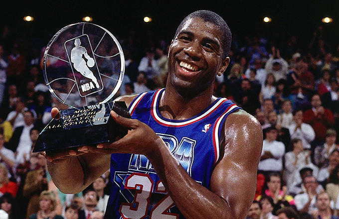 9、因为感染HIV,约翰逊自从1990-91赛季后被迫退役。1992年2月10日奥兰多全明星赛,身为退役球员的魔术师复出打了这场比赛。最终西部队153-113胜出,约翰逊出战29分钟得到25分9助攻5篮板,生涯第二次拿下全明星赛MVP。约翰逊的这次参赛既向大众普及了艾滋病的相关知识,也完美诠释了体育精神。