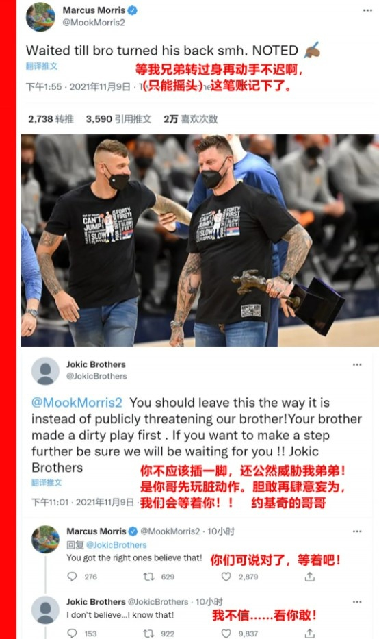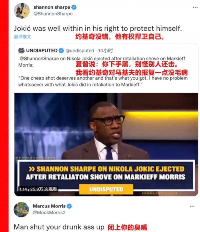 再说这莫里斯兄弟,不仅动作粗野,而且嘴上不饶人。曾拿到过NFL橄榄球冠军的明星夏普看不下去,说约基奇有权捍卫自己,小莫立刻将他骂回去。