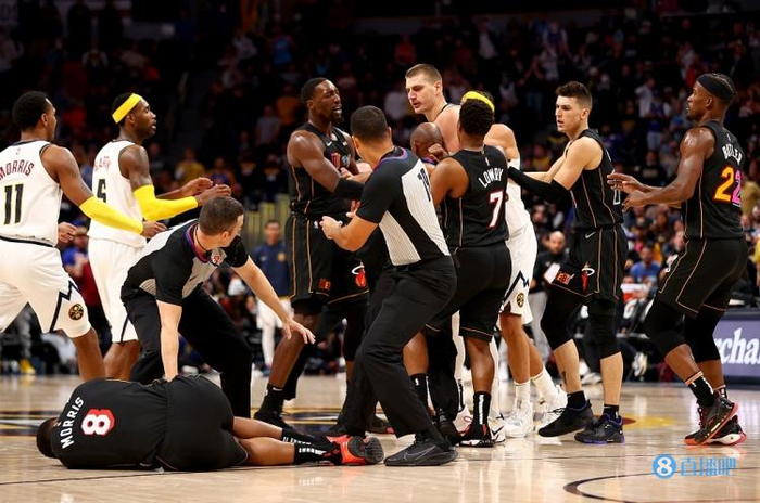 事发昨天掘金和热火的比赛最后2分41秒,当时大局已定,掘金111-94领先,阿德巴约上篮时被约基奇盖帽打中左臂后倒地,裁判没有响哨,约基奇抓下篮板就发动反击。这时斜刺里冲出来大莫里斯,狠狠把约基奇撞开,约基奇怒从心头起,恶向胆边生,追上去从背后将大莫撞倒在地。