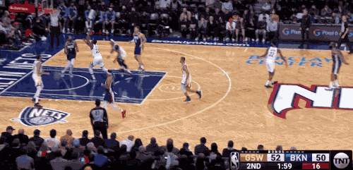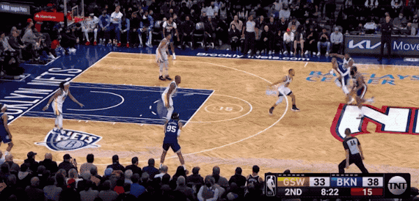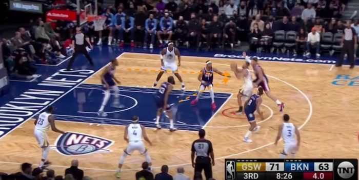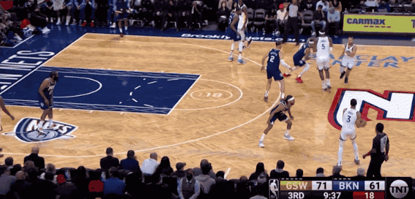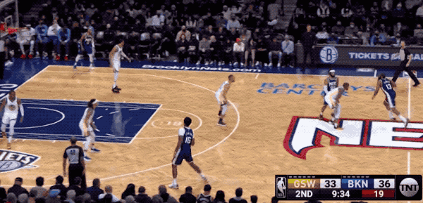 对阵篮网的比赛就有无数这样的“库有引力”镜头(原谅我用这个烂俗的描述),第二节9:19,就出现过一个库里扯动对方防守撕出空挡的典型镜头: